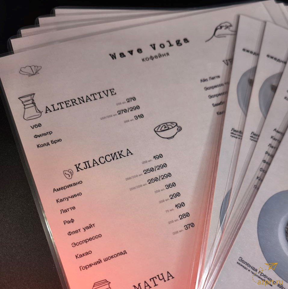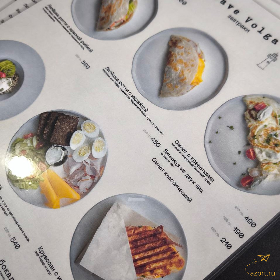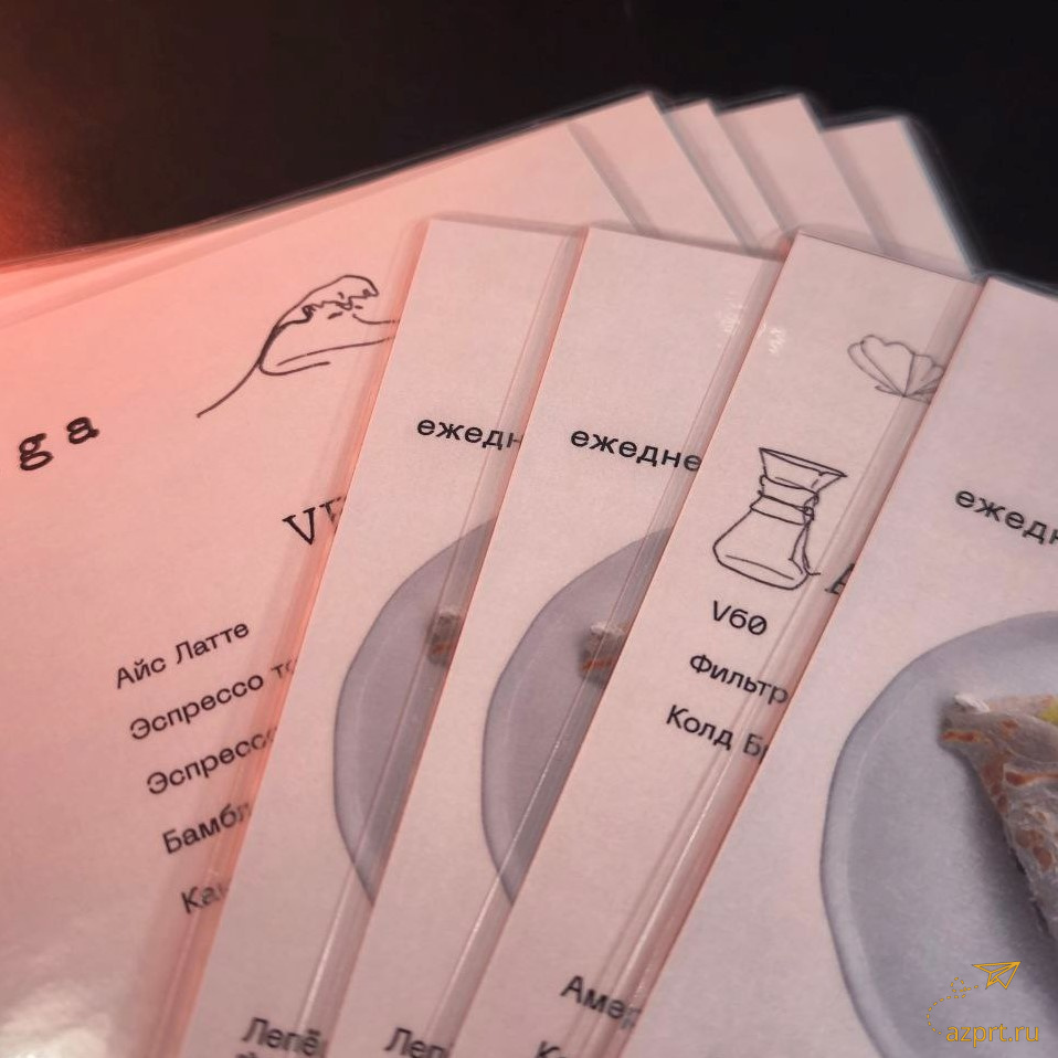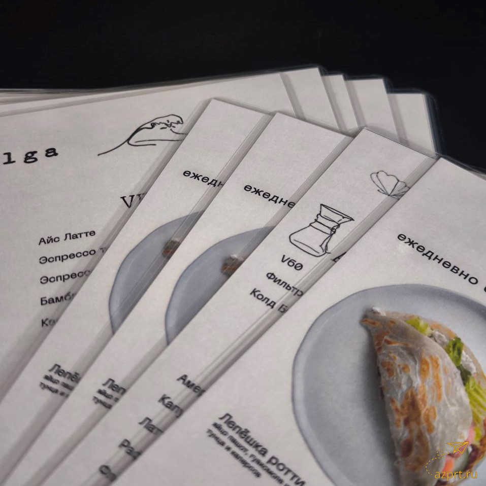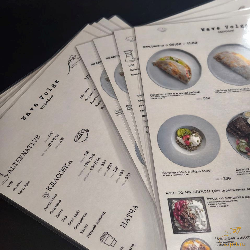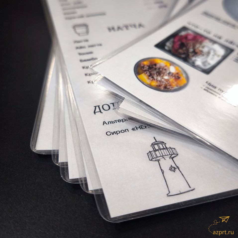 - Меню A4 (210х297мм), бумага мелованная матовая белая Hi-Kote 300гр, печать лазерная цветная 4+4, резка р, ламинация пакетная глянцевая 216х303мм 75мкм